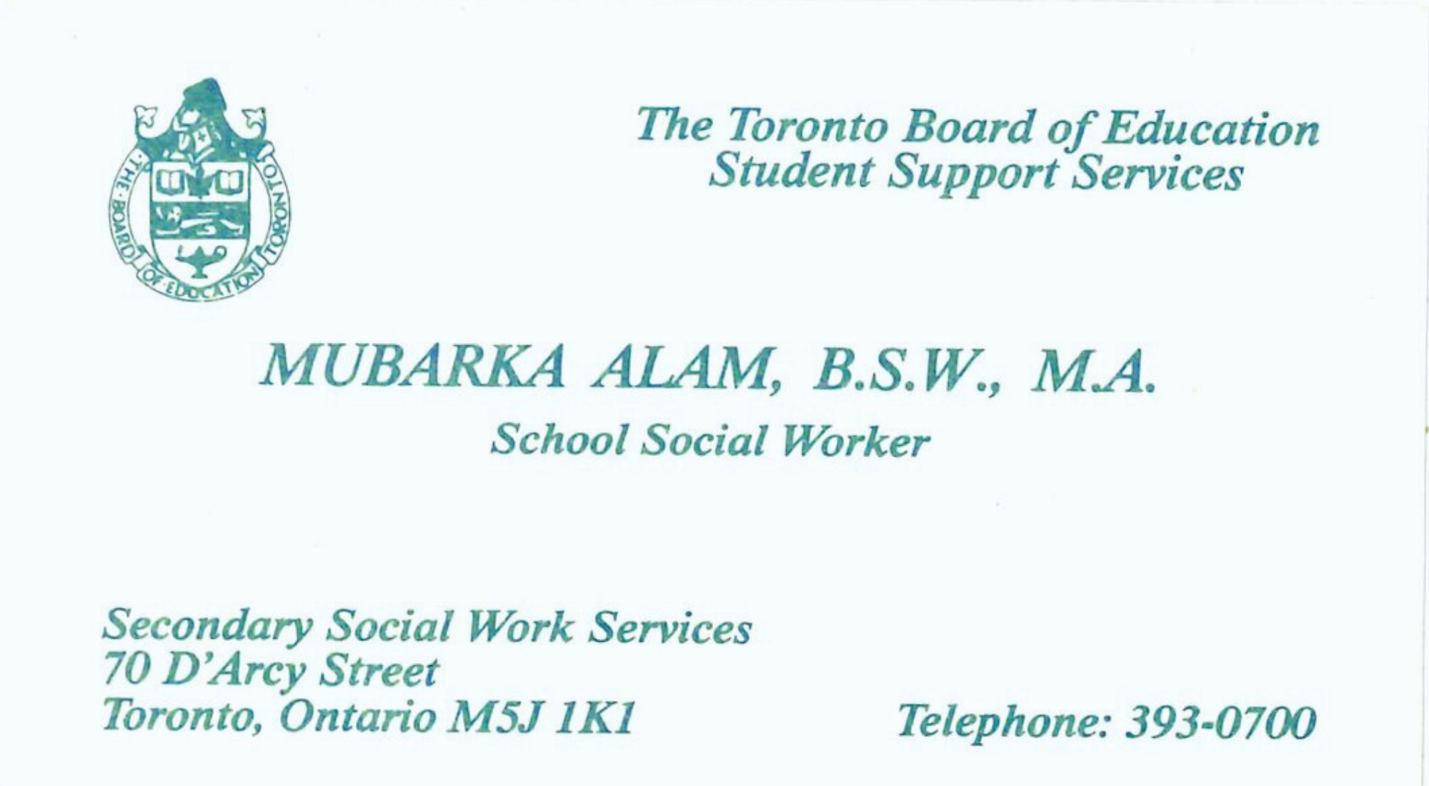 For Mubarka’s daughter, Raseema Alam, their home often had the environment of an emergency room. Mubarka would frequently take calls at all hours of the night and often leave home to assist people in crisis – offering informal services similar to, now formalized, community crisis services. Mubarka recalls that, while her role as a social worker was not always valued, the importance of this work became clear as she supported people in need.